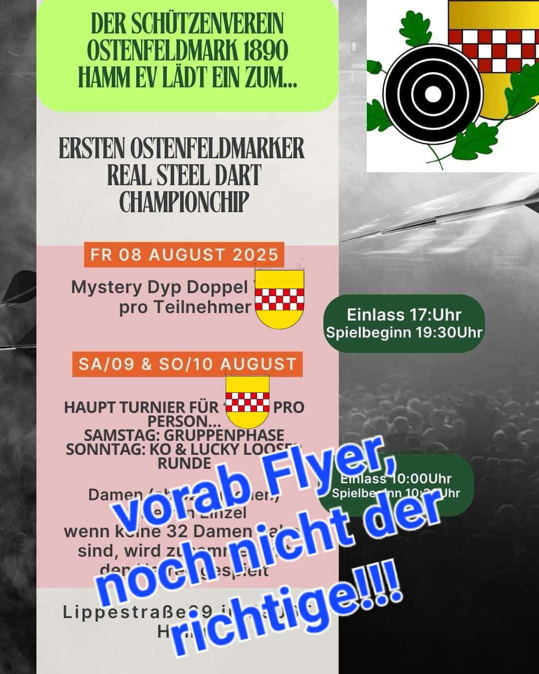 Im Schützenheim Ostenfeldmark finden vom 08.08 bis 10.08.2025 die erste „RealSteel Darts Meisterschaft" statt.
