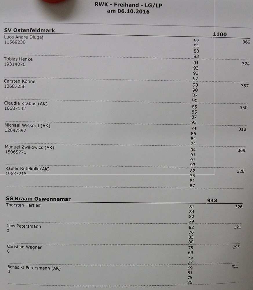 Auf dem eigenen Stand schaffte es unsere Freihand-Mannschaft, am 06.10.2016, die Mannschaft aus Braam Ostwennemar mit 1100:943 zu schlagen. Erfreulich war auch die rege Teilnahme der Mannschaftsmitglieder der Ostenfeldmark. Es traten 5 Luftgewehr- und 2 Luftpistolen-Schützen an.