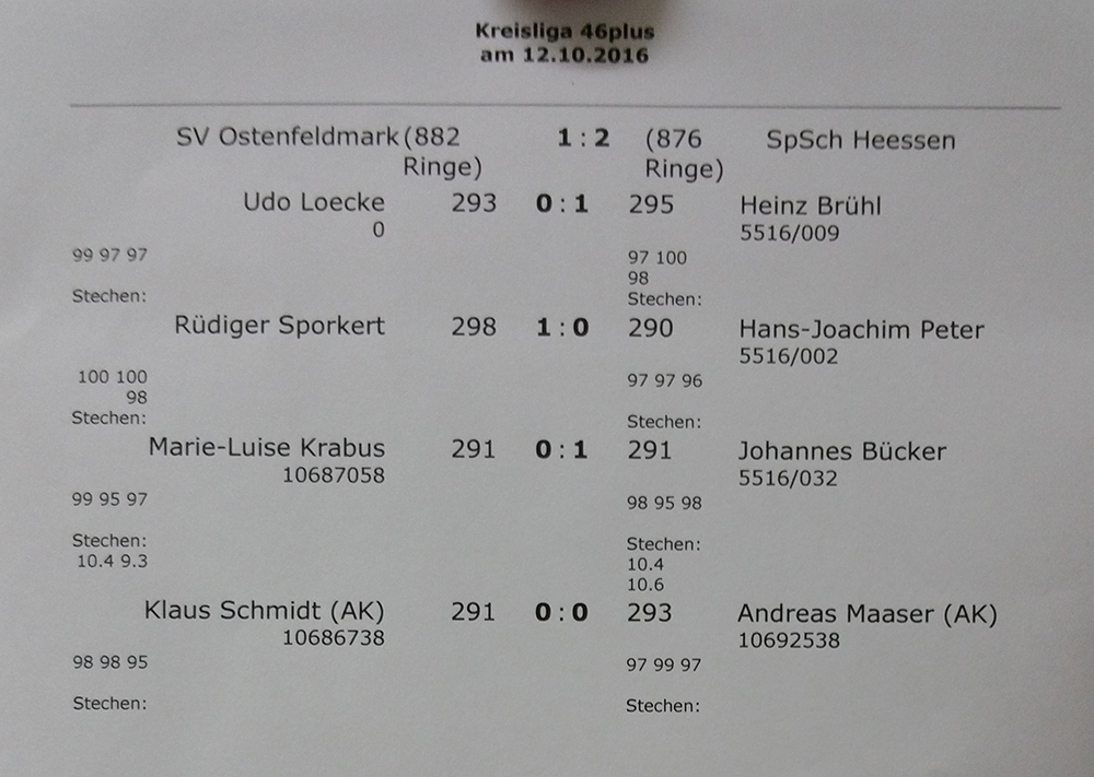 Marie-Luise Krabus musste, wie auch schon im ersten Ligawettkampf, ins Stechen, welches sie leider verlor. Rüdiger Sporkert schaffte als einziger einen Punkt für seine Mannschaft zu bekommen.