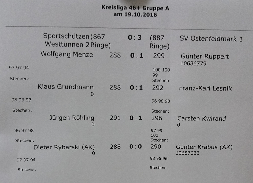 Die 1. Mannschaft der Ostenfeldmark schaffte es auf dem heimischen Stand einen souveränen 0:3 Sieg gegen den Gastgeber aus Westtünnen einzufahren. Geschossen würde auf dem Stand der Ostenfeldmark, da der Stand in Westtünnen zu dem Zeitpunkt nicht zur Verfügung stand.