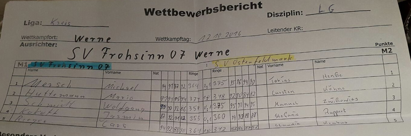 Im zeitgleich stattfindendem Wettkampf in der Kreisliga LG schaffte es die Mannschaft der Ostenfeldmark die Gastgeber vom SV Frohsinn 07 Werne mit 3:2 zu schlagen.