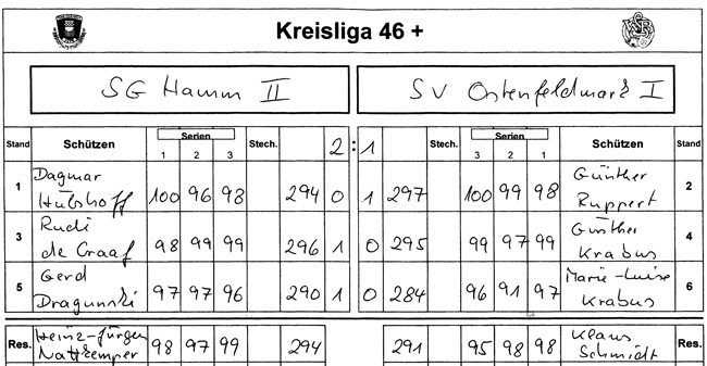 Während Günter Ruppert mit dem Tagesbestergebnis von 297 Ringen sicher gegen Dagmar Hülshoff punktete und Marie-Luise Krabus nach technischen Problemen mit ihrer Schießbrille gegen Gerd Dradunski unterlag, war Rudi de Graaf von der SG der Matchwinner, da er mit überraschend guten 296 Ringen gegen Günter Krabus (295) gewinnen konnte.
