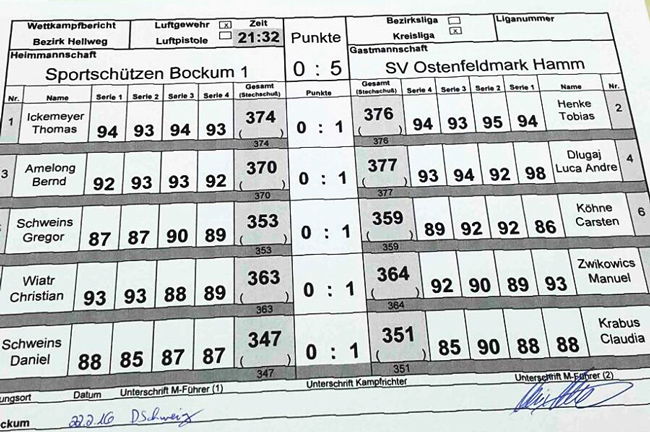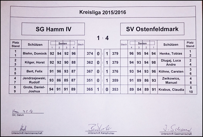 Verdient 4:1 gewann das LG-Freihand-Team gegen die 4. Mannschaft der SG Hamm. Besonders erfreulich aus Sicht der Ostenfeldmarker war das Ergebnis von Carsten Köhne, der mit einer konstanten Leistung 376 Ringe erreichte und damit nicht mehr weit von seinen Teamkollegen Tobias Henke und Luca Dlugaj liegt, die jeweils 379 Ringe erzielten.