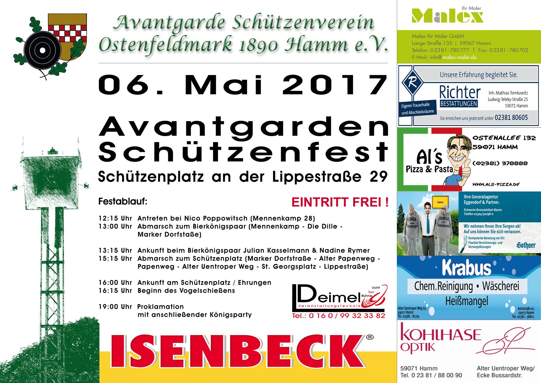 „Die Vorbereitungen laufen bereits auf Hochtouren.“, so Julian Kasselmann, 1. Kommandeur der ostenfeldmarker Avantgarde. „Neben dem Spielmannszug Hamm Nordenfeldmark konnte auch der Spielmannszug des Kirchspiel Märkischen Schützenvereins erneut für das Fest gewonnen werden. Nach dem Kaiserschießen sorgt DJ Dennis von Deimel Veranstaltungstechnik für ausgelassene Stimmung im Schützenheim.“